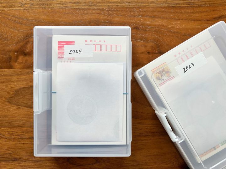 保管には、100均で買えるハガキ収納ケースが使えます。1年分をまとめてこのケースに入れるだけ。いつの分かマスキングテープに書いて貼っておけば、見返したい時にすぐに分かりますね。更に、宛名ごとに輪ゴムでまとめて分けておけば、自分のものをすぐに取り出すことができます。残しておきたいものは「思い出」と書いて保管するのもいいかも。