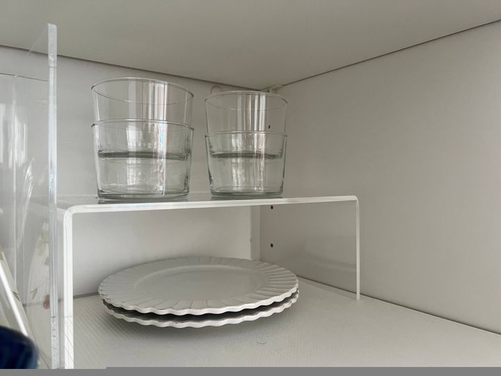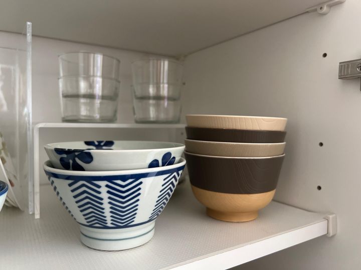食器棚は奥行があるものが多く、奥に置いた食器は取り出しにくくなりがち。そこでコの字仕切棚を奥に置くことで、仕切棚の上下両方に食器を置くことができるようになるので、空間を有効に使うことができます。