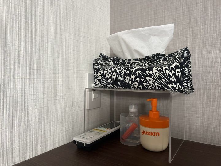 寝る前に使いたいケア用品や、エアコンのリモコンを一箇所にまとめておくのにも活躍。使いたい人が必要に応じて取って使っています。場所が決まっていれば、使う時も片付ける時もシンプルで、気持ちよく使うことができます。